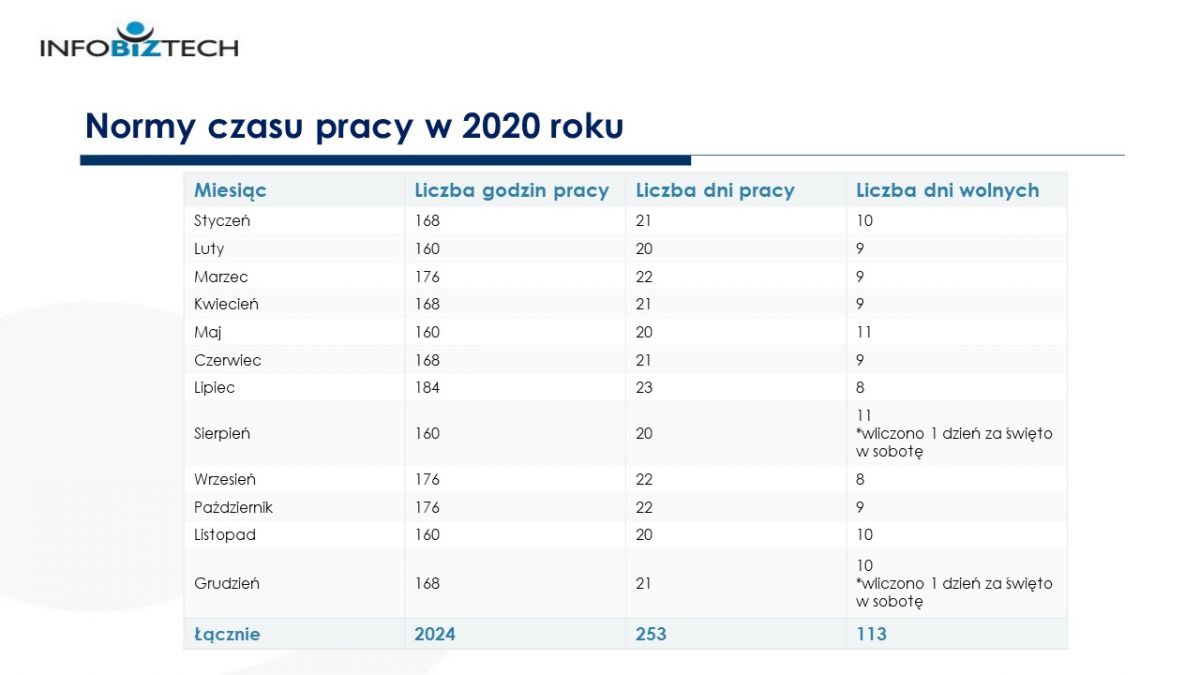 W 2020 roku całkowity, roczny wymiar czasu pracy wynosi 2024 godziny (253 dni x 8 godz.).